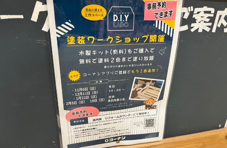 高槻市城西店にあるコーナンで塗装のワークショップがあります。