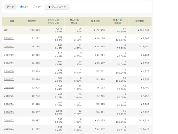 過去5年までしかデータを集計できなくて、一番古いデータが2018年。アフィリエイトをやっていたのは10年以上前で、ここ10年はほとんど放置状態なんですけど、それでもアクトレだけで年間10万円くらいの収入がありました。セルフバックだけを抽出できなかったんですけど、2018年は10,000円もなかったと思います。